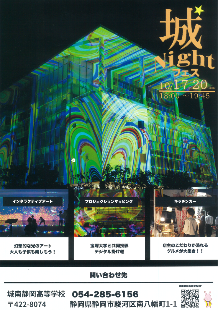 生徒が宝塚大学と共同投影するプロジェクションマッピングや、インタラクティブアートをご覧いただけます。また、キッチンカーも当日来るので、お楽しみください。